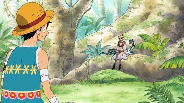 Im Gegenzug hierzu erklärt er ihr, dass er ein Pirat sei und dringend ein Schiff benötigt damit er seine Freunde wieder treffen kann. Die Amazone erzählt ihm, dass es auf ihr ebenfalls eine Piratenbande gibt – nämlich die von Boa Hancock, ihrer Königin. Im letzten Moment fällt ihr jedoch ein, dass es ja eigentlich ihre Aufgabe sei, Ruffy zu töten – so schießt sie nun pflichtbewusst einen Pfeil auf diesen. Doch dem Gummimann gelingt es ohne Probleme auszuweichen. Doch dann erscheinen wie aus dem Nichts die anderen Amazonen.