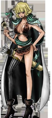 Um ihren Rücken trägt sie zudem einen hellen Umhang, wie dies unter Amazonen üblich ist. Des Weiteren ist sie mit Pfeil und Bogen bewaffnet. Und um ihren Hals trägt sie hin und wieder eine schwarz-grüne Schlange.