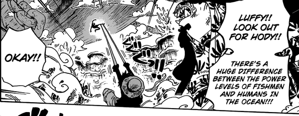 Ruffy und Sanji sind derweil dabei, sich mit Hilfe von „Armée de l’air – Gomu Shoot“ auf die Noah katapultieren zu lassen. Jinbei warnt die beiden noch vor Hodi. Sie sollen den ihn nicht unterschätzen. Im Wasser verfügen Fischmenschen über beachtliche Kräfte.
