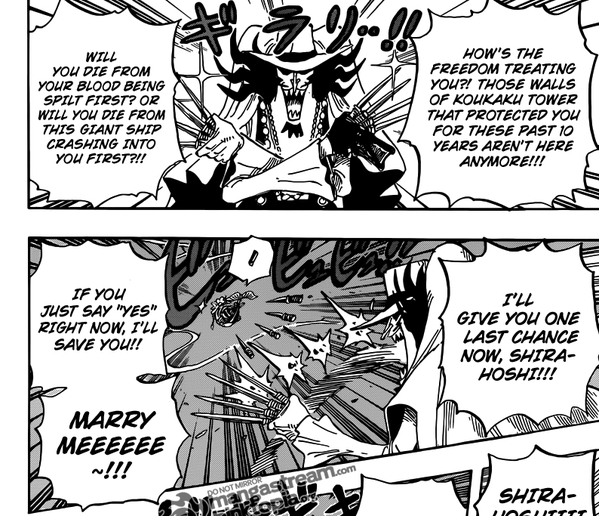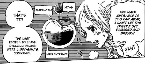 Prinzessin Shirahoshi ist gerade im Begriff über den Korridor in Richtung Palast zu fliehen. Sie allein ist in der Lage, die Aufmerksamkeit der von van der Decken gesteuerten Noah von der Insel auf sie selbst zu lenken. Van der Decken, lacht höhnisch und brüllt, dass eine Flucht zwecklos sei, da er sie überall finden würde. Obwohl die Prinzessin um ihr Leben schwimmt, zweifelt sie daran den Korridor noch rechtzeitig zu erreichen. Zu dicht an der Blasenwand muss sie entlang schwimmen, damit die auf Shirahoshi getriggerte Noah nicht tiefer zum Mittelpunkt der Blase taucht. Die schützende Luftblase droht immer noch zu platzen.