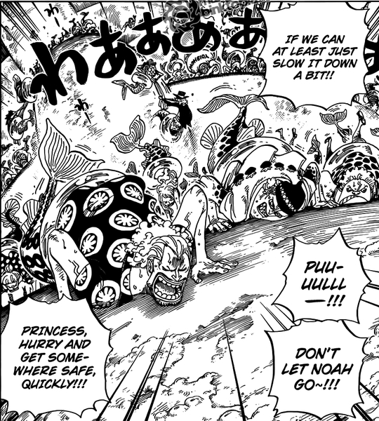 Derweil versuchen auch die restlichen Bewohner der Insel Prinzessin Shirahoshi mehr Zeit zu verschaffen, indem sie mit vereinten Kräften an die Noah hängen um sie schiebender Weise zu verlangsamen.