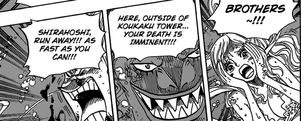Hodi Jones macht sich nun auf, Prinzessin Shirahoshi zu töten. Auf dem Weg zu ihr, stellen ihm sich jedoch ihre Brüder in den Weg. Er fackelt nicht lange und lässt seine Klinge tanzen. Shirahoshis Brüder können ihre Schwester, die dieses Szenario mit Schrecken beobachtet, nur noch warnen so schnell wie möglich zu flüchten.