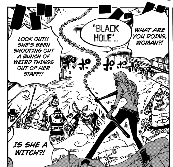 Auf der Plaza geht es heiss her. Wadatsumi ist immer noch ausser sich vor Wut. Nami ist zur gleichen Zeit mit einer Horde Piraten beschäftigt, die sich mit „Black Hole“ in Schach zu halten versucht. Sie lässt sich von der Meute in keiner Weise beeindrucken und setzt stattdessen mit „Lion Rod“ noch einen drauf. Dies bleibt nicht unbemerkt und so versuchen Zeo und Ikaros sie aufzuhalten. Der unsichtbare Zeo packt Nami an den Beinen, während Ikaros sie mit seinen Speeren attackiert. Die Navigatorin der Strohhüte wundert sich, wieso sie sich nicht bewegen kann. Gerade noch rechtzeitig, bemerkt Brook den Angriff auf die Nami und kann den Angriff erfolgreich vereiteln indem er sich zwischen Nami und Ikarus wirft. Zum Leidwesen des Angreifers zeigt die Waffe an Brooks ausgedörrtem Körper nicht ansatzweise Schaden.