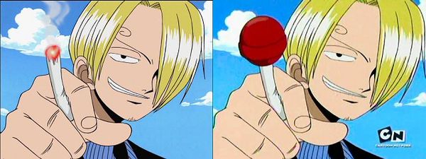 - Man trifft ihn meist mit einer Zigarette in der Hand. Allgemein ist auch bekannt, dass er Kettenraucher ist. Jedoch wurde dieser Umstand in der amerikanischen Variante abgeschwächt. Dort lutscht er im Anime nahezu ununterbrochen Lollies.